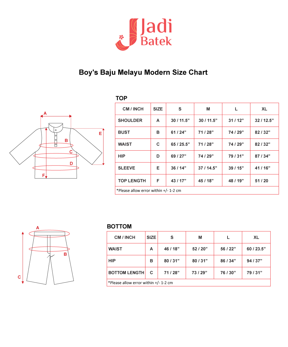 Celebrate traditions with a modern twist! This Boy Baju Melayu Cekak Musang is designed to keep your little one looking dapper while staying comfortable throughout the festivities. Made with high-quality fabric and detailed with intricate batik patterns, this outfit is a perfect choice for Raya, weddings, and special occasions.