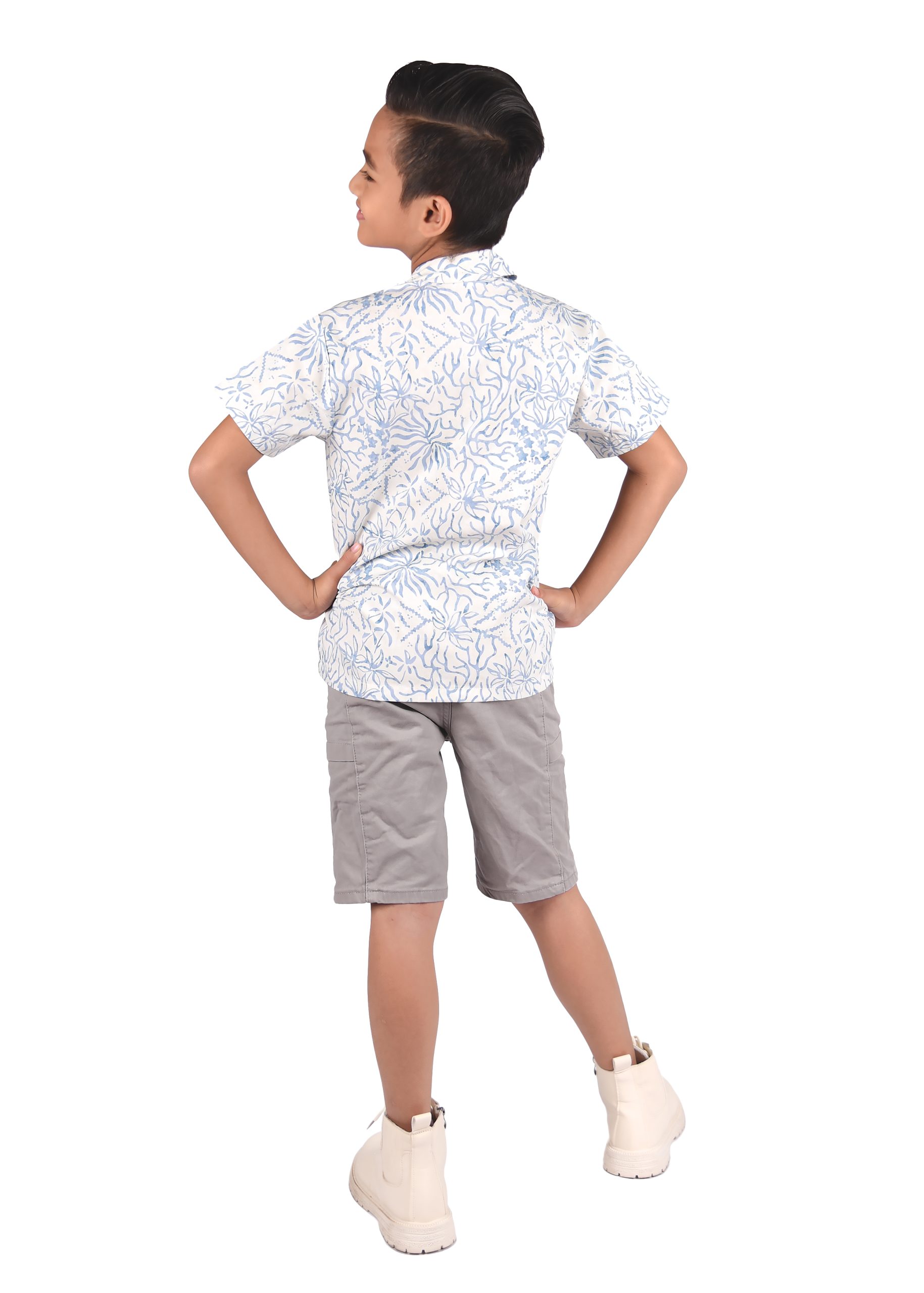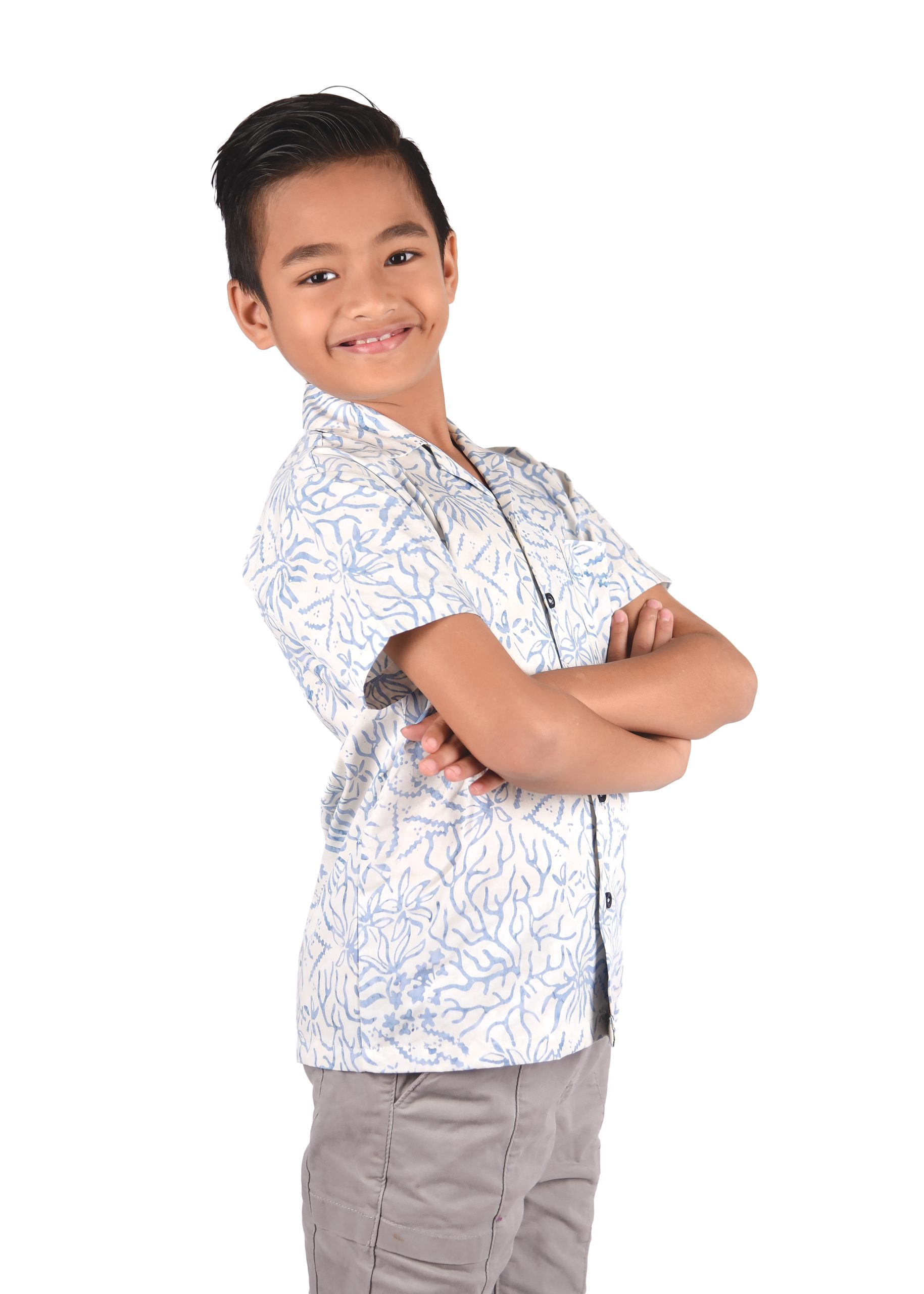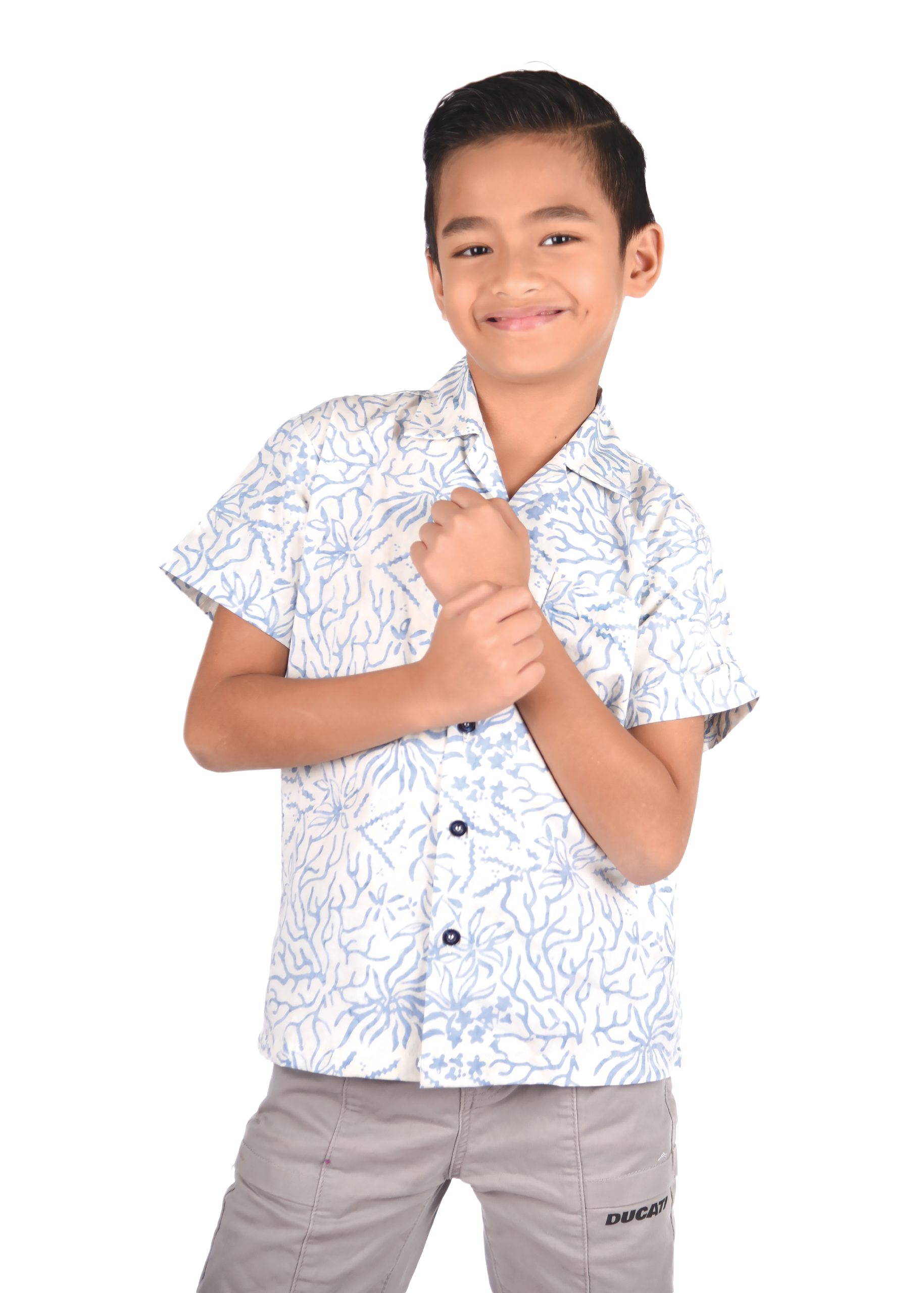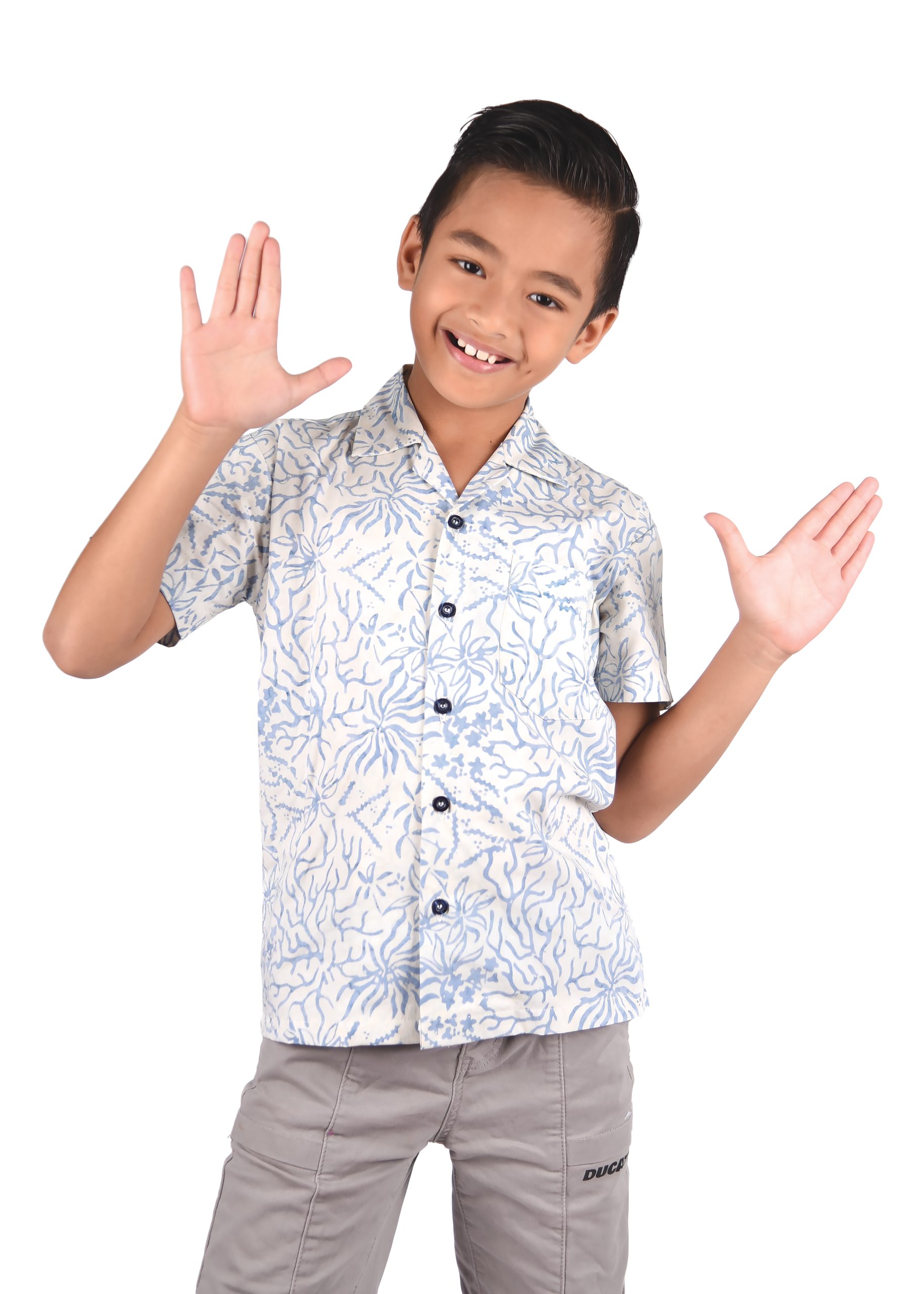 This particular type of batik is the stamped batik or block-printed batik. The canting will be replaced by a copper block or sometimes a wooden stamp with artistically patterned bottom. The block is dipped into wax and printed onto the fabric, which is then dip-dyed. Then the wax will be removed and batik with single color is produced. To create multi-colors and more complex block-printed batik, waxing with different blocks and de-waxing will be done many times. The 100% cotton material is a perfect combination as a boy Batik shirt for your wardrobe as it is long lasting despite daily usage and is easy to wash.