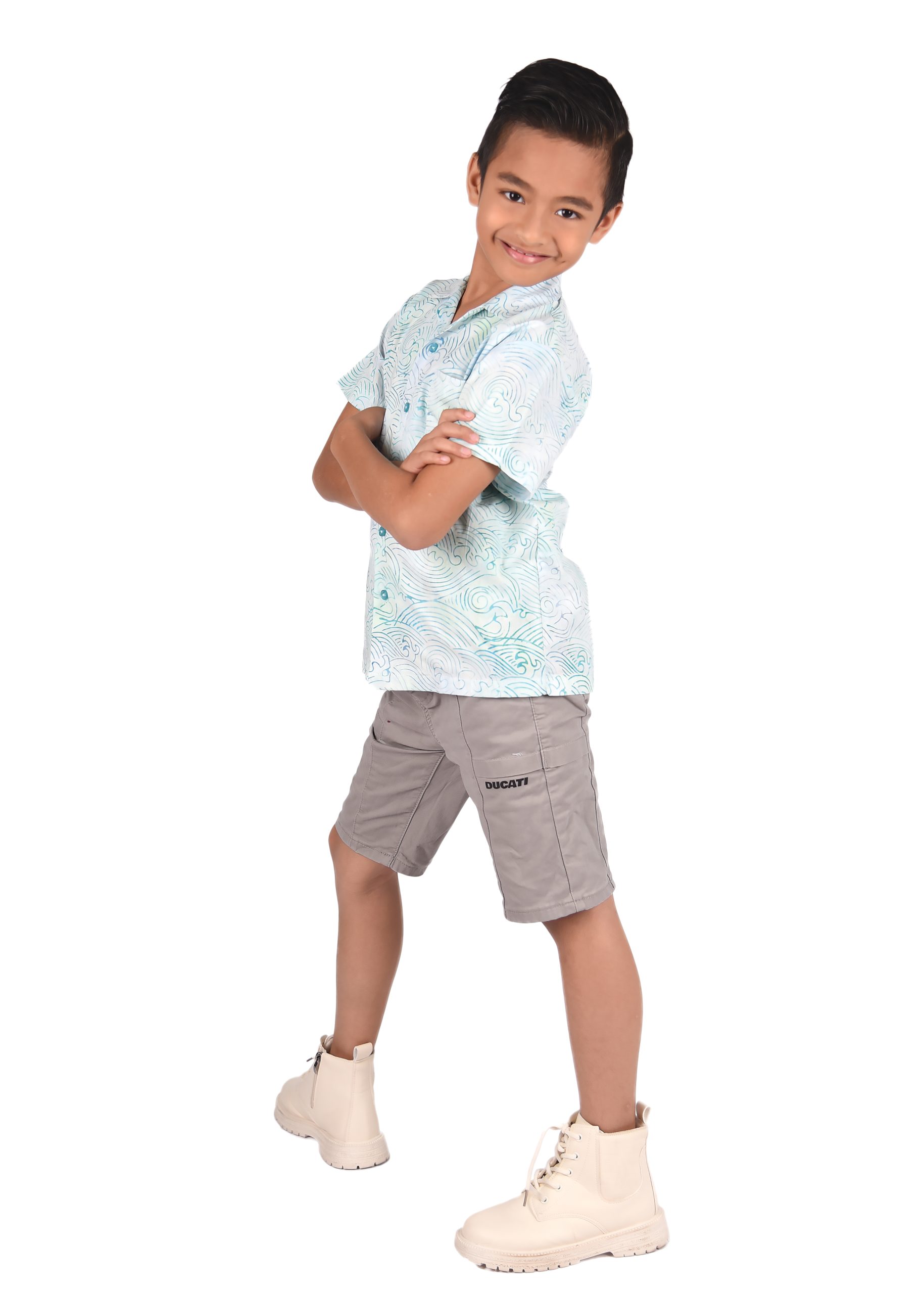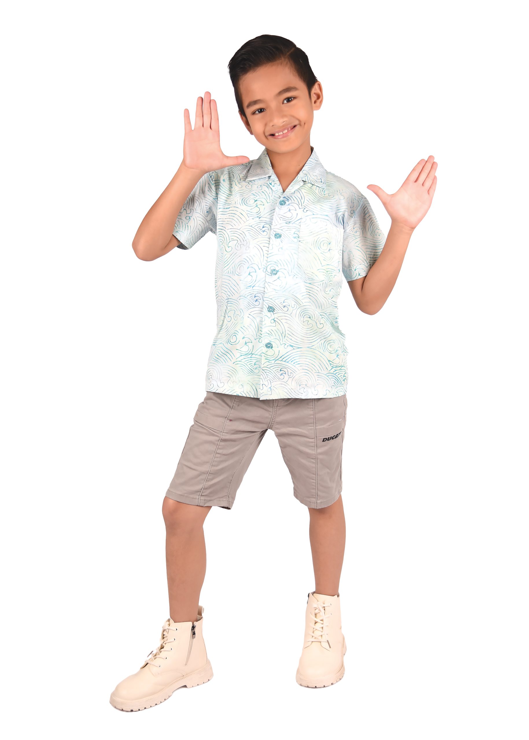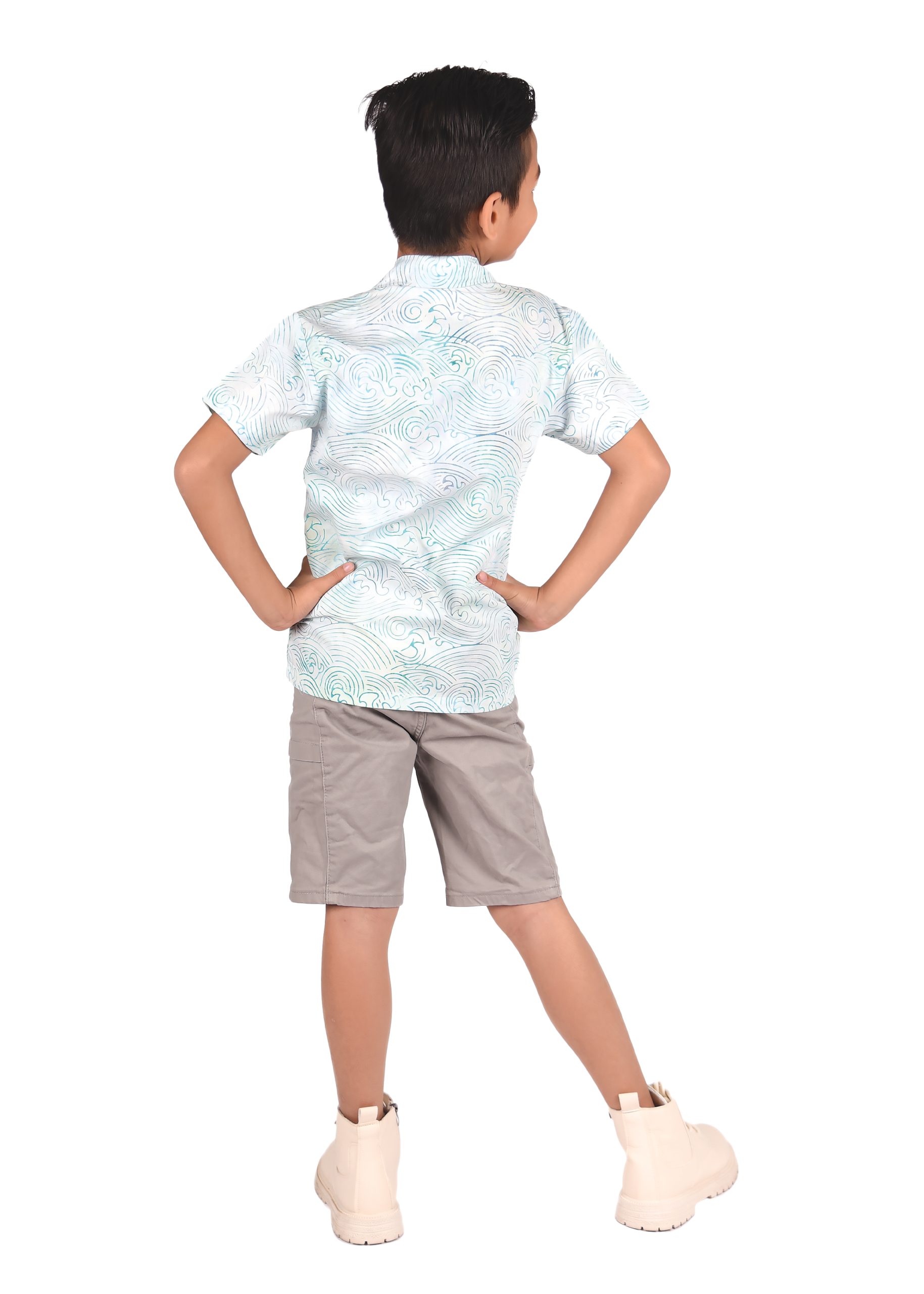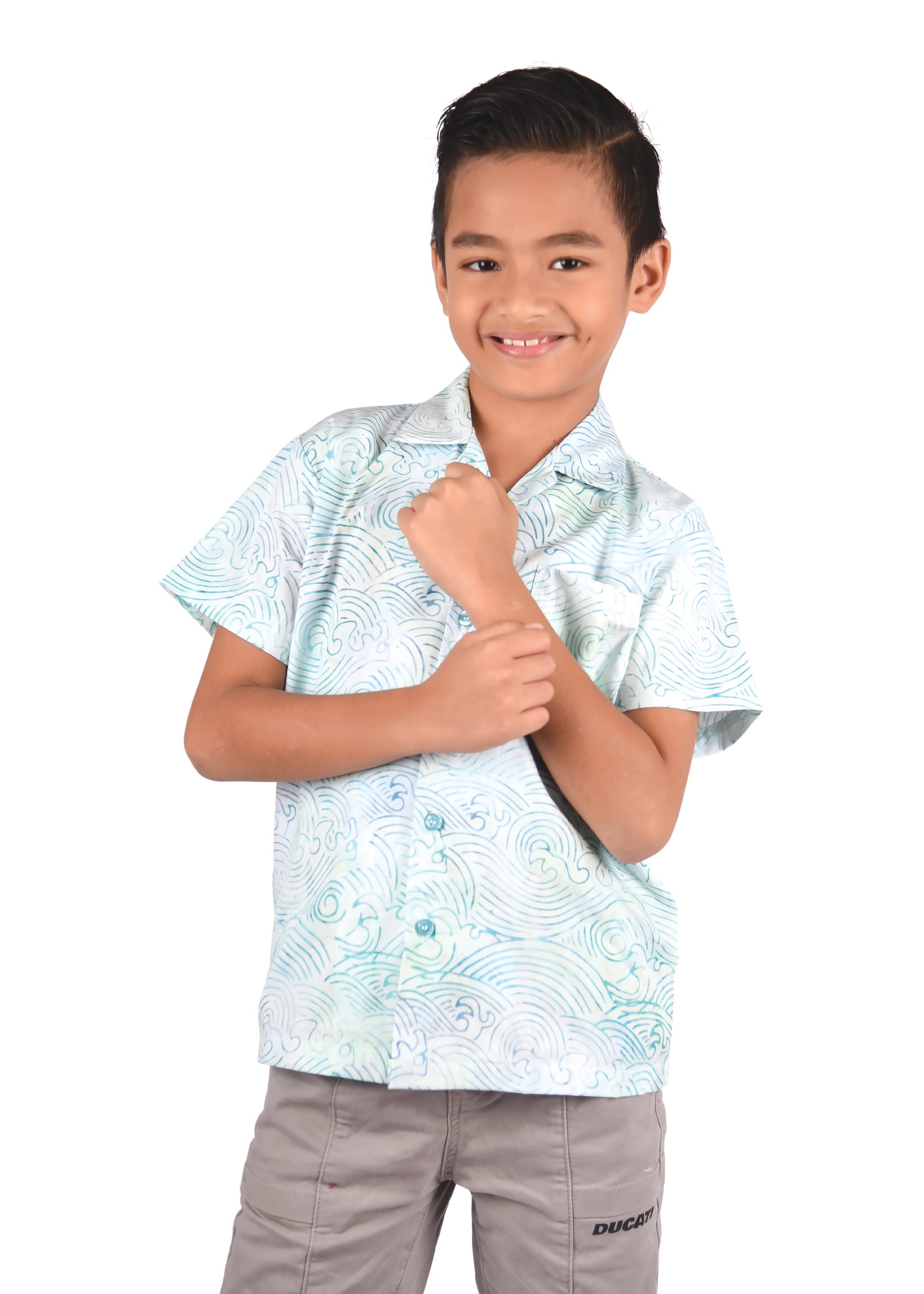 This particular type of batik is the stamped batik or block-printed batik. The canting will be replaced by a copper block or sometimes a wooden stamp with artistically patterned bottom. The block is dipped into wax and printed onto the fabric, which is then dip-dyed. Then the wax will be removed and batik with single color is produced. To create multi-colors and more complex block-printed batik, waxing with different blocks and de-waxing will be done many times. The 100% cotton material is a perfect combination as a boy Batik shirt for your wardrobe as it is long lasting despite daily usage and is easy to wash.