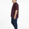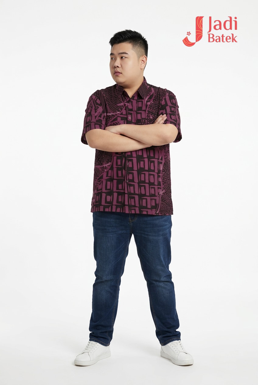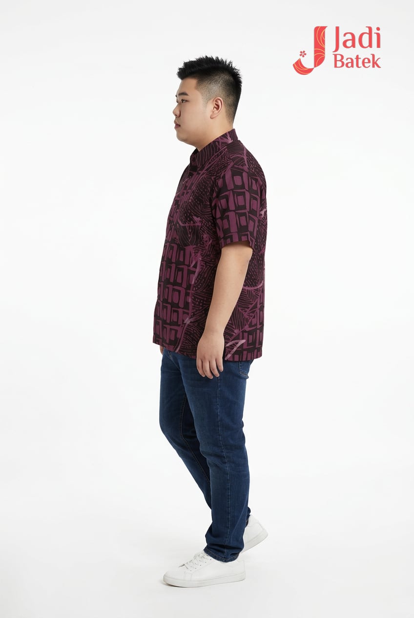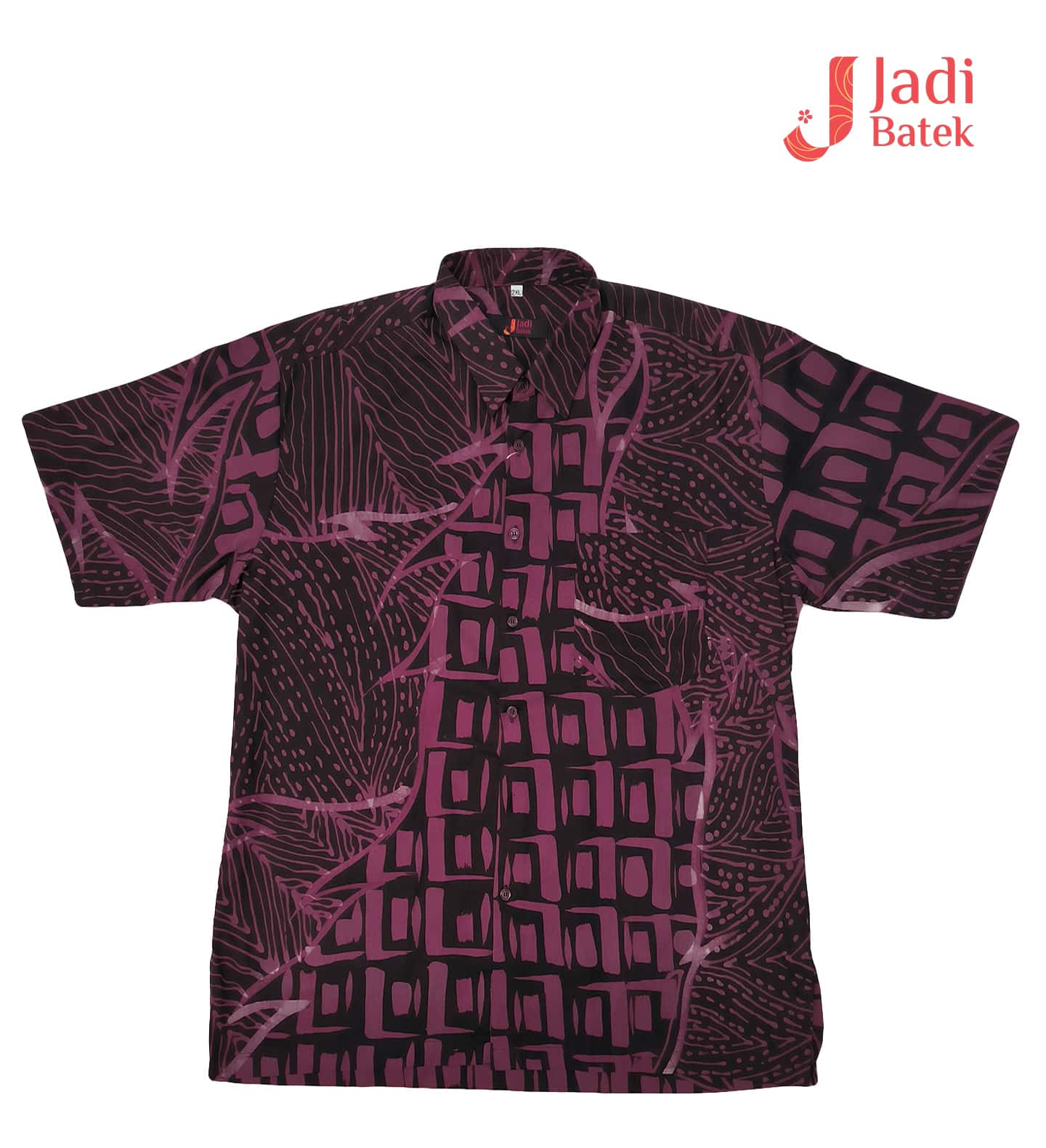 Exude effortless sophistication with this artisan-made short-sleeve batik. Featuring a complex, multi-layered design, this shirt combines structured geometric blocks with organic leaf-like motifs. The deep maroon and black palette offers a rich, moody aesthetic that transitions perfectly from day to night.