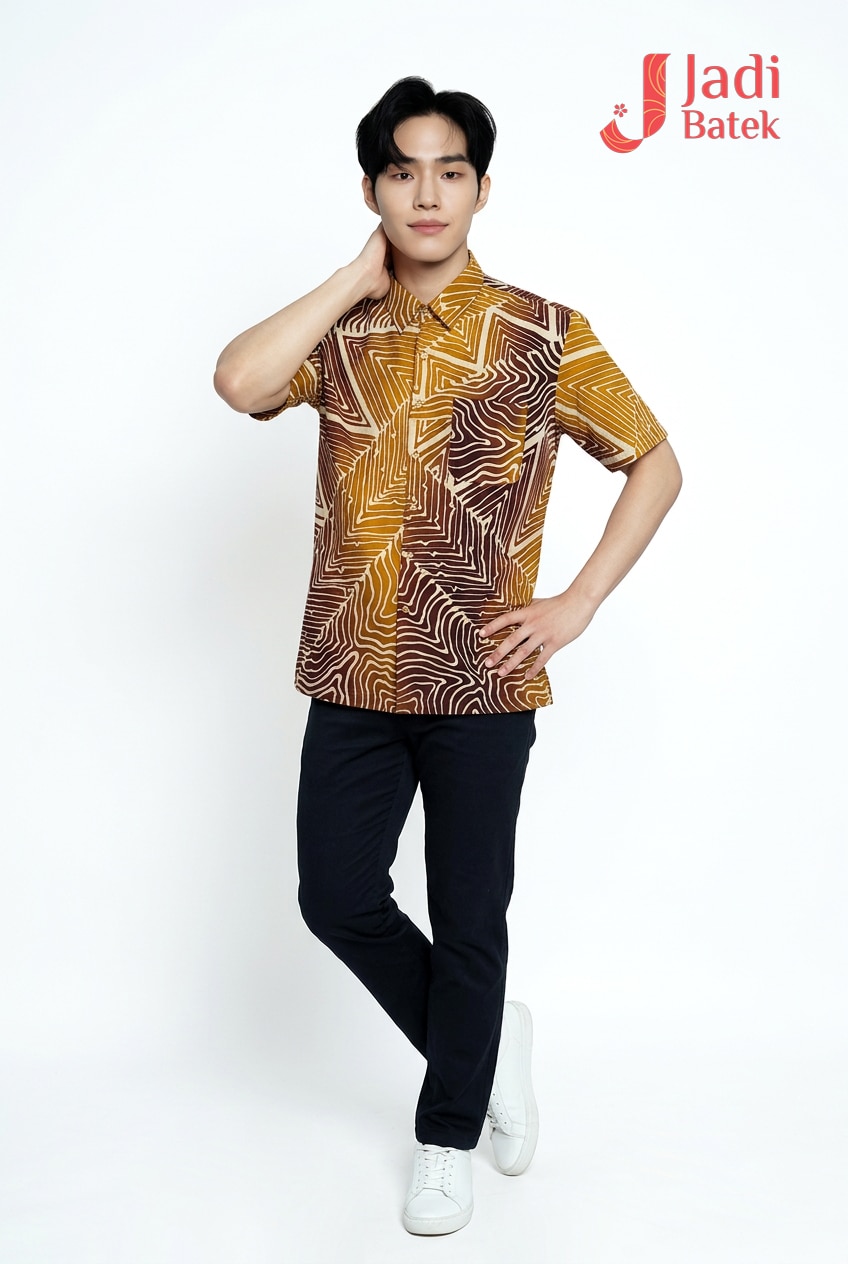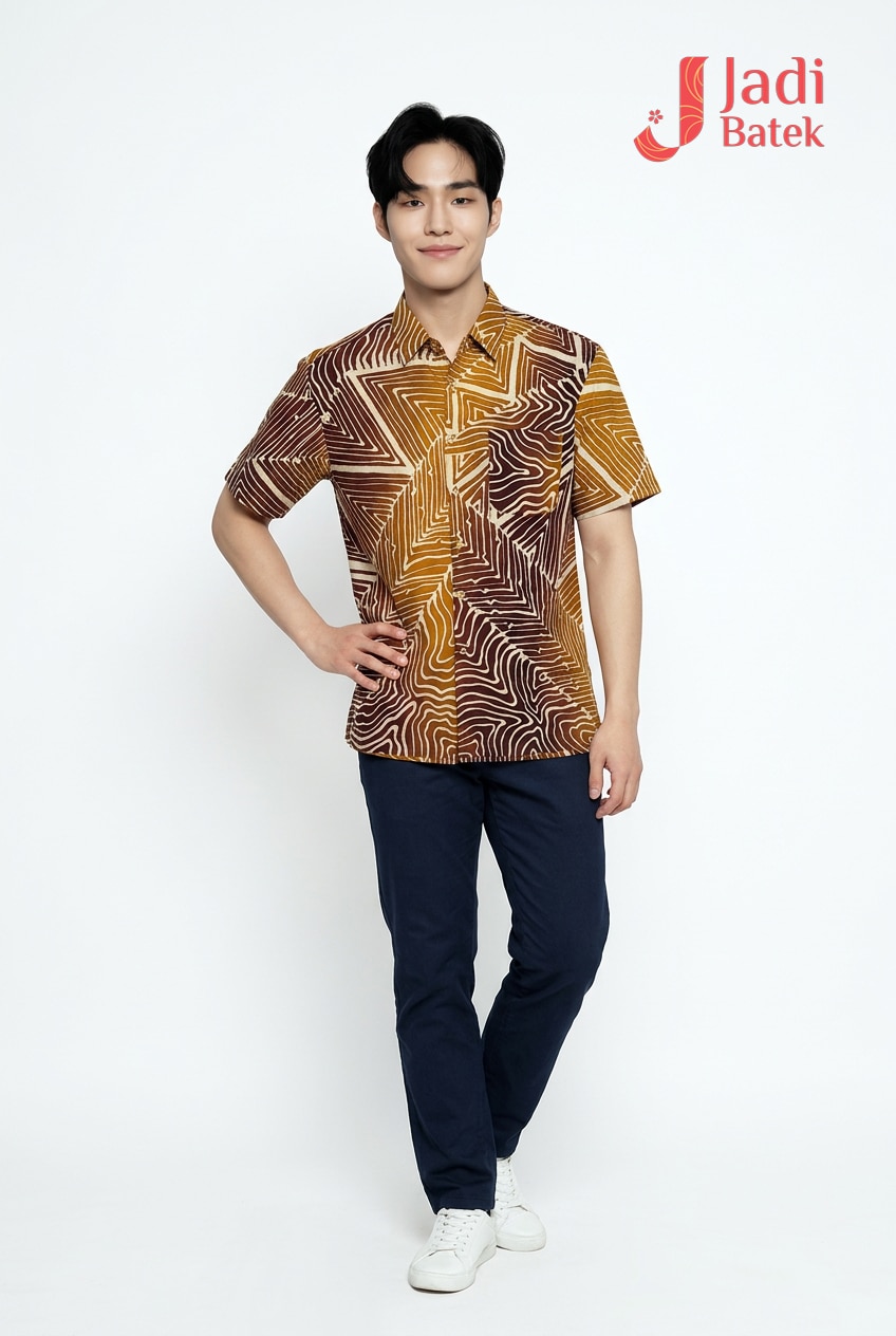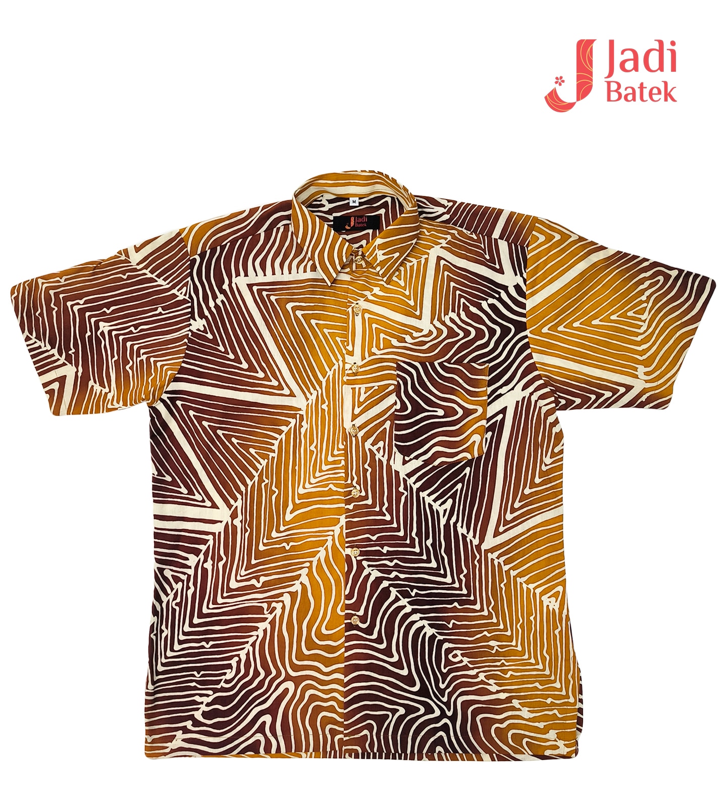 Add a sophisticated, organic touch to your collection with this artisanal short-sleeve batik. Featuring a hypnotic “concentric diamond” motif and labyrinthine line work, this shirt showcases a warm, earthy gradient that transitions beautifully from golden amber to deep mocha.