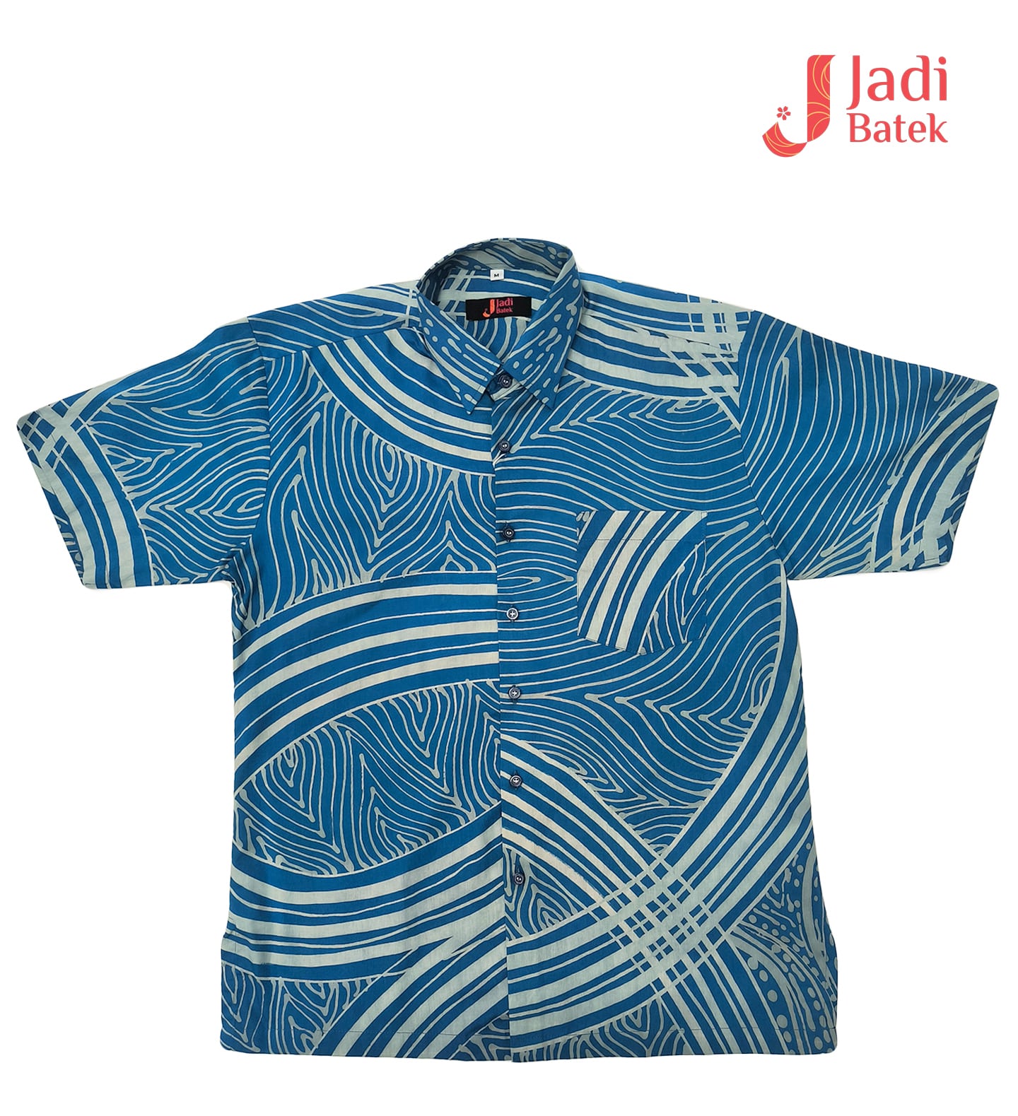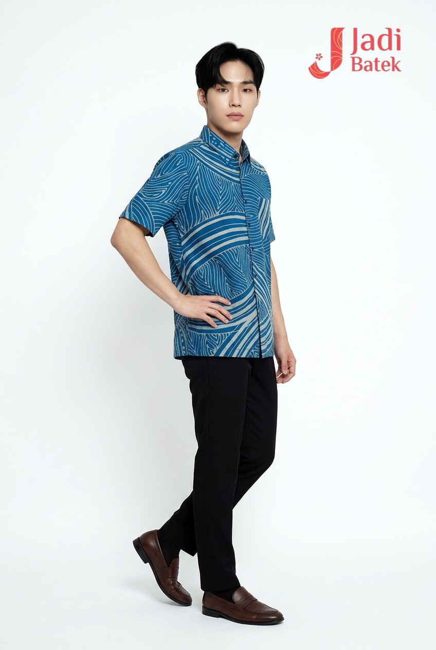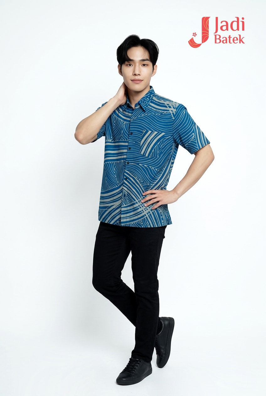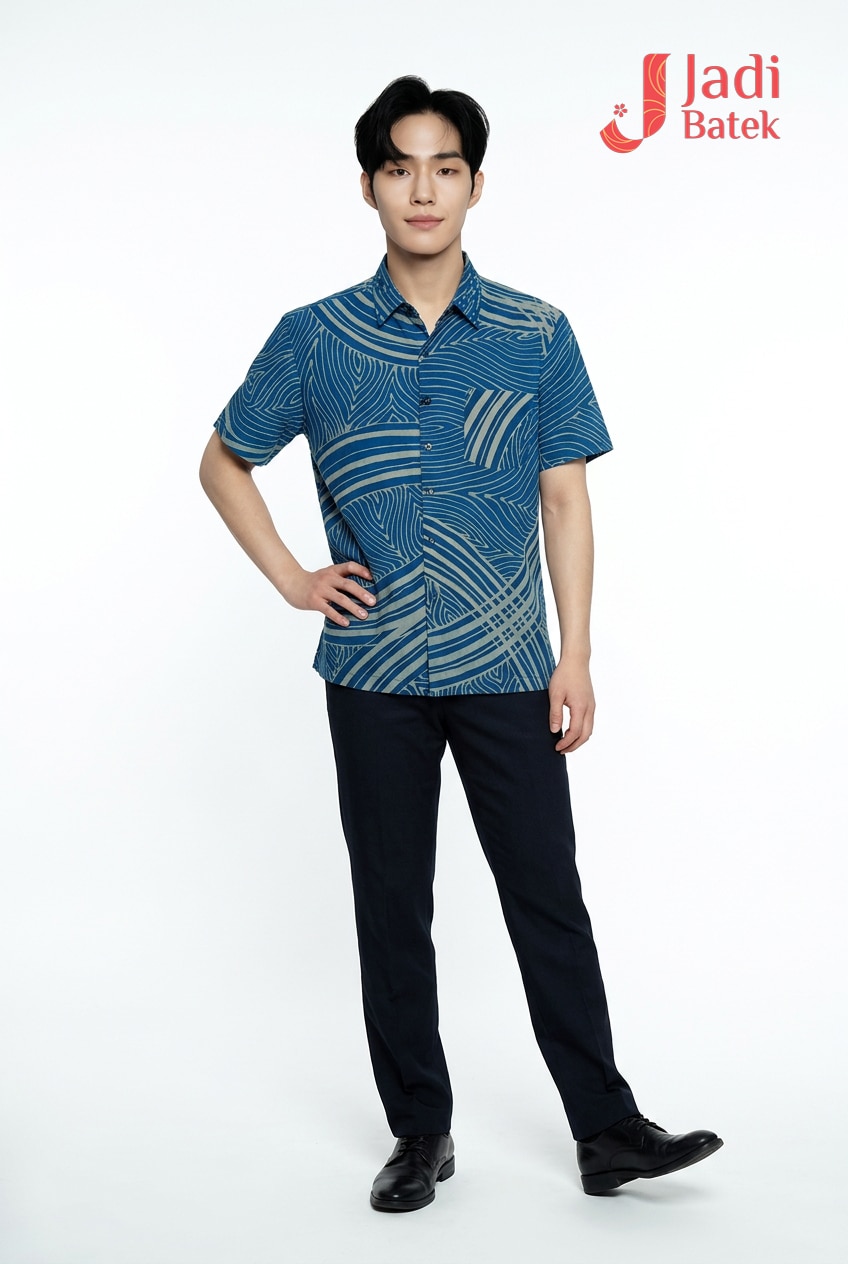 Refresh your style with this artisanal short-sleeve batik. Featuring a dynamic flow of hand-drawn wave motifs and rhythmic stripes, this shirt captures the essence of the ocean in a sophisticated, modern layout.
